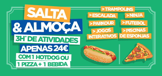 Válido sábado, domingo e feriados das 12:00 às 15:00. Acesso ao parque por 3 horas e menu pizza (pizza + bebida) na zona lounge. Não acumulável com outras promoções. Sujeito a disponibilidade.