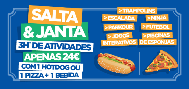 Válido sábado, domingo e feriados das 17:00 às 20:00. Acesso ao parque por 3 horas e menu pizza (pizza + bebida) na zona lounge. Não acumulável com outras promoções. Sujeito a disponibilidade.